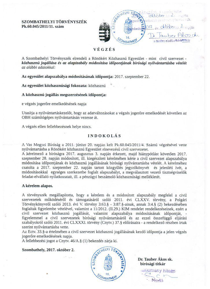 Az egyesület neve: Rönökért Közhasznú Egyesület